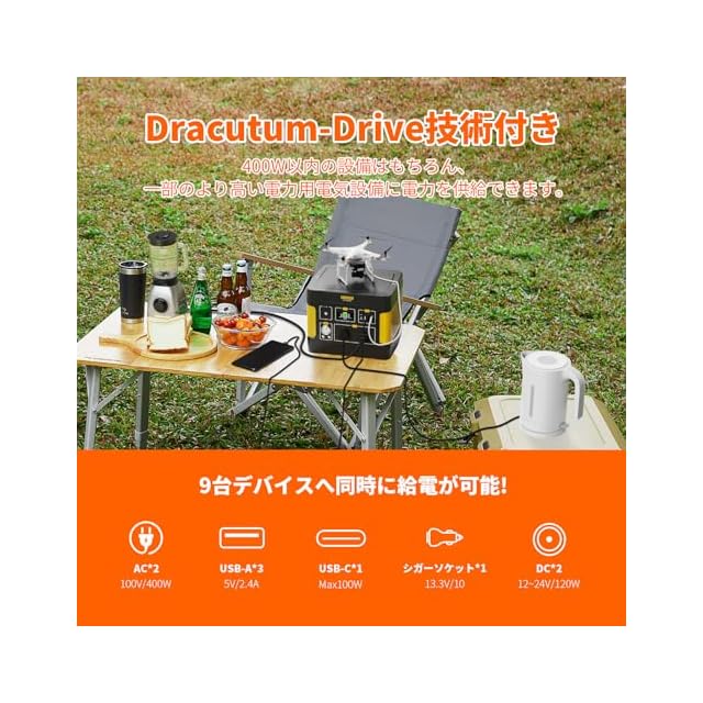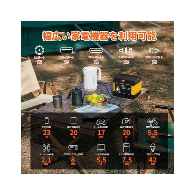 【大容量 355Wh/110938mAh】355Whの電力容量を持ち、他の用バッテリーよりも同じ電子機器を効果的に長く使用することができます。フル充電後、携帯電話、ノートPC、電気炊飯器、車載用冷蔵庫、ジューサー、ドローンなどを充電し、自宅/旅行/キャンプ/RVに使用することができます。多数の家電やデジタル製品が利用可能です。ご家庭の防災備品にも最適です。