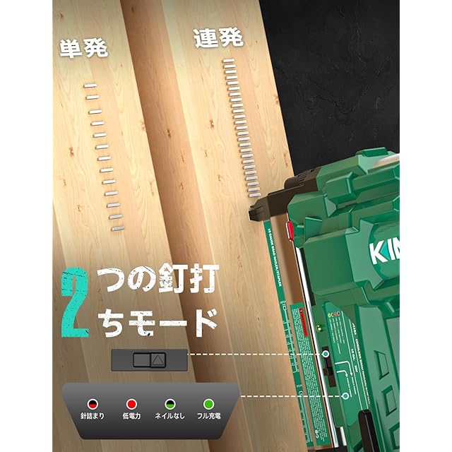 【単発/連発切替で作業効率アップ|タッカーガンの新時代】KIMO 電動タッカーガンは、単発モードと連発モードを切り替え可能な高機能モデルで、さまざまな現場のニーズに応えることができます。本体に搭載された簡単操作の切替スイッチにより、瞬時にモード変更が可能。繊細な打ち込みが必要な場面では単発モードで正確な作業を行い、大量のネイルを素早く打つ必要がある場合は連発モードに切り替えてスピーディに作業を進められます。このタッカーガンは、家具製造やインテリア工事、建築現場、DIYなど、用途によって使い分けられる設計となっています。たとえば、棚板の補強やボードの固定には連発モードで一気に施工し、角材の微調整やディスプレイ用木枠には単発モードで丁寧に仕上げるといった使い方が可能です。KIMOの電動タッカーガンは、スピードと精度、そして使いやすさを兼ね備えた一台。あなたの作業効率を大幅に向上させる頼れるパートナーです。