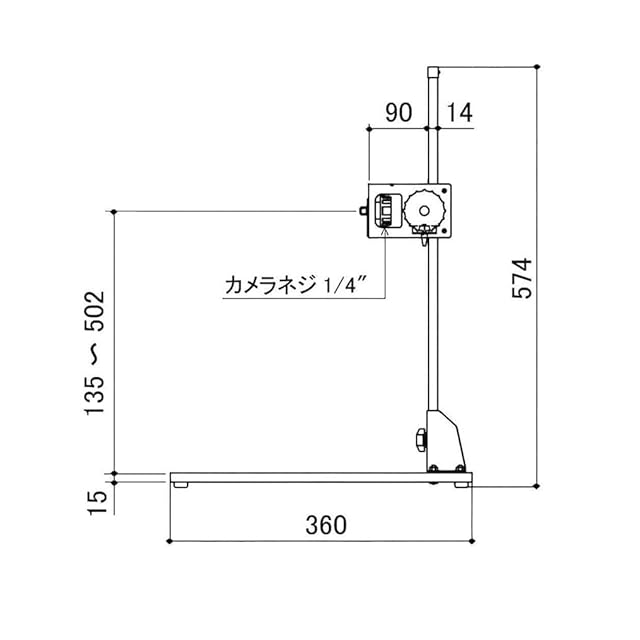 スタンド部:●全長:574mm●ベースボード:300x360x15mm●支柱全長:550mm●クランクハンドルを開くとブレーキ解除されそのまま上下移動/位置決め後クランプハンドルをたためばブレーキ作動し固定●上下移動量:135~502mm(ベースボード上からカメラプレートカメラネジ部)●/カメラクッション寸法35x40mm●カメラネジ:1/4インチ●最大積載量:3kg●総重量:約2.6kg