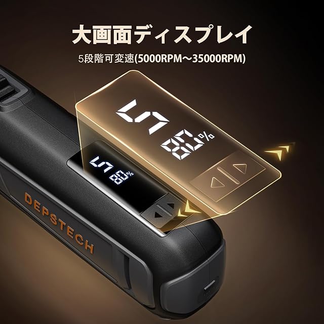 【デジタルパネル&残量表示】この12VリューターはLEDデジタルパネルを搭載しており、バッテリー残量と回転数の段階が一目で分かりますバッテリー残量は10段階で表示され、10%、20%、30%、40%、50%といった整数表示で、電池が突然切れる心配がありませんまた、5段階の回転速度は、加工材料や付属品の種類に応じて適切な速度を選択できます