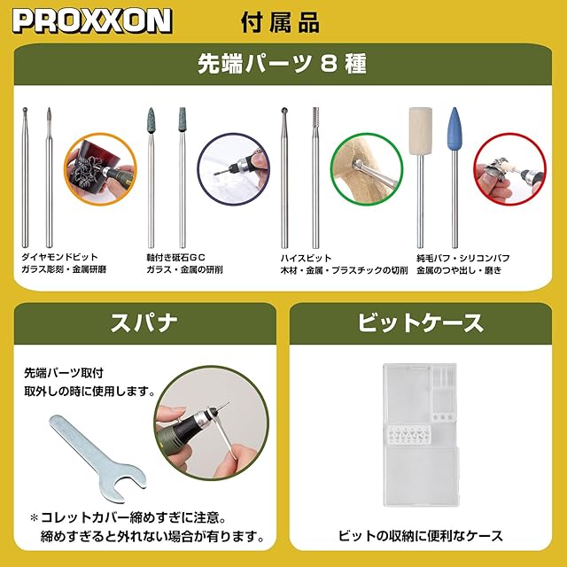 付属品:ダイヤモンドビット2種・ハイスビット2種・軸付き砥石2種・純毛バフ1本・シリコンバフ1本・専用ビットケース1個・スパナ