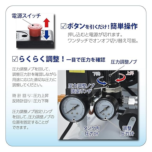 使用最高圧力:約0.8MPa(8.2kgf/cm2)、安全弁設定圧力:約0.88MPa(9.0kgf/cm2)、リリース起動圧力:約0.5MPa(5.1kgf/cm2)、吐出圧力設定範囲:約0~0.8MPa(0~8.2kgf/cm2)、充填時間:50Hz 約5分・60Hz 約4.5分、接続(吐出)口:ワンタッチソケット1/4、タンク容量:約22L、騒音値:約70dB/m