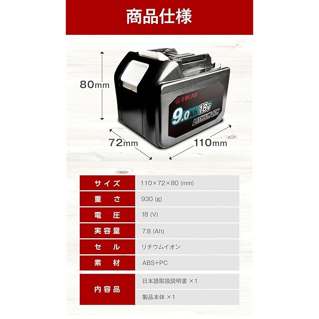 【商品説明】日本の会社が安全性や品質にこだわって企画し、正規のPSEの届け出を自社で行い、ISO9001認証の信頼できる中国工場にて生産しているMAKITA 互換バッテリーです。12ヶ月の長期は製品への自信の証。マキタ純正の電動工具はもちろん、草刈機、掃除機、集塵機、ブロアー、空気入れなど18Vの機種には全て対応しており、問題なくご使用いただけます。DC18RC、DC18RF、DC18RAなどの純正バッテリー充電器での充電も可能です。