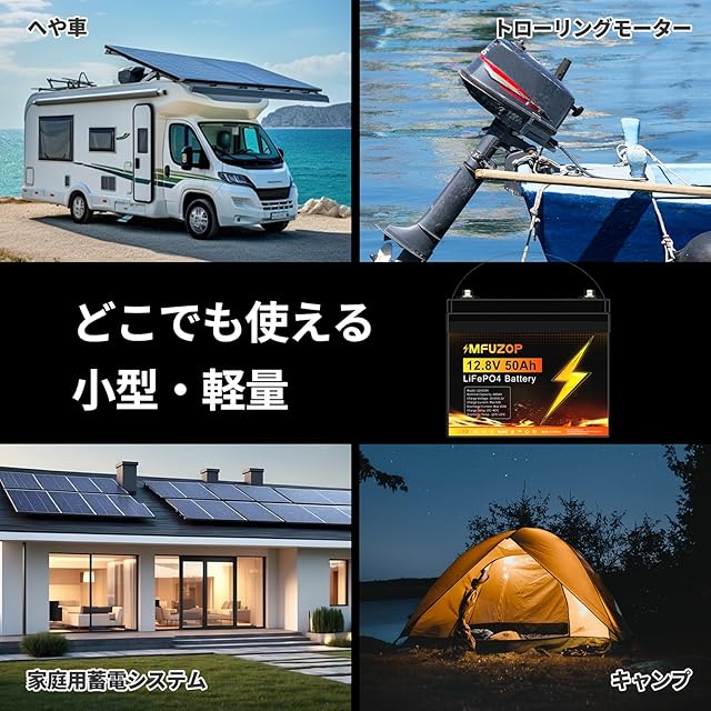 【幅広い用途】MFUZOP 12V50Ah LiFePO4 ディープサイクルバッテリーは、大電流に対する強い耐性、高い充電効率、安定した性能を備えています。 複数の家電製品を同時に使用できます。大容量であるため、太陽光発電システム、RV、船舶、屋外キャンプ、オフグリッド家庭用エネルギー貯蔵、その他のディープサイクルアプリケーションで広く使用されています。