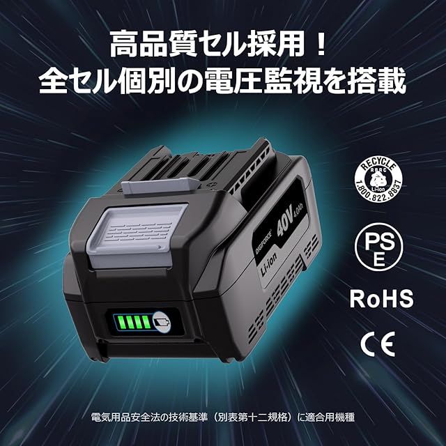 【高品質と認証】高品質なリチウムイオン電池セルを採用。PSE(日本適合性マーク)、CE、RoHSなどの規格認証を取得しており、信頼性と耐久性に加え、環境基準にも適合しています。