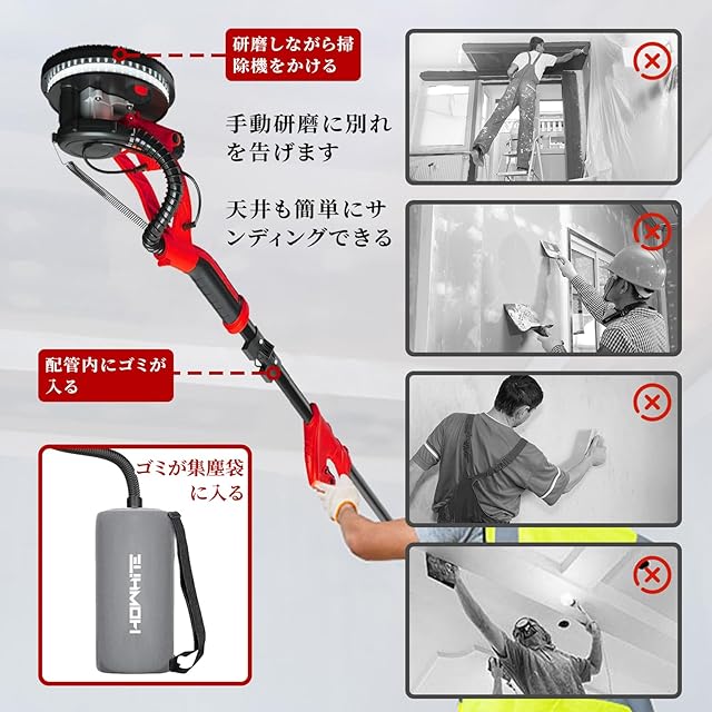 Howhite 電気ドライウォールサンダー 800W ポールサンダー 伸縮可能なハンドル 110V乾式壁サンダー、6段変速 1000-2100RPM、自動掃除機システムとLEDライト付き、ロングダストホース、集じん袋、サンディングディスク 収納袋付き