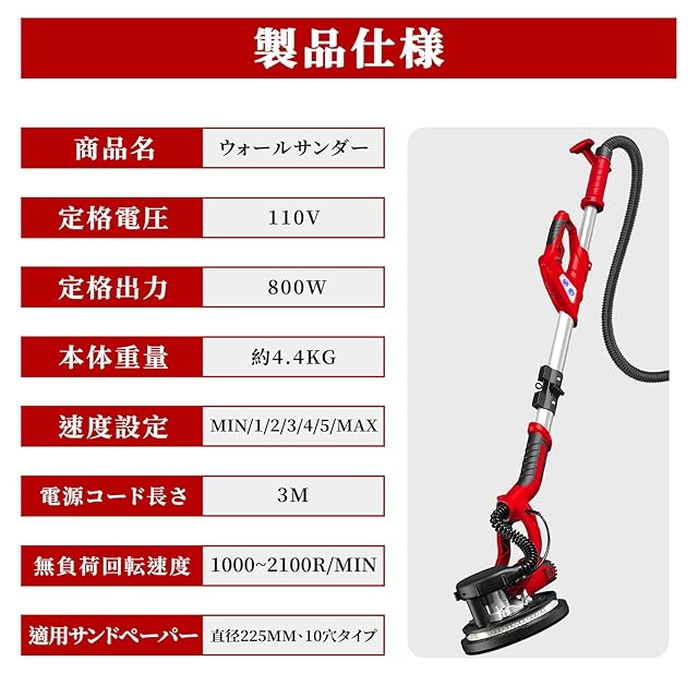 【製品情報】定格電圧:110V。定格出力:800W。無負荷回転速度:1000~2100r/min。本体重量:約4.4kg。最大ポール長さ:165cm。頭部上下フローティング幅:5mm。電源コード長さ:3m。適用サンドペーパー:直径225mm(9インチ)、10穴タイプ。