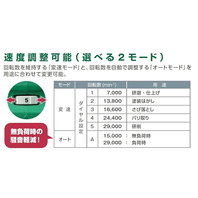 2モードの速度調整機能を搭載。回転数を維持する「変速モード(5段階)」と回転数を自動で調整する「オートモード」で作業に合わせて簡単に調整できます。