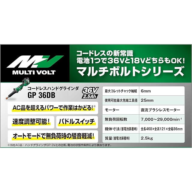 HiKOKI(ハイコーキ) 36V コードレス ハンドグラインダ 軸径6mm 7,000~29,000回転 ダイヤル式無段変速 パドルスイッチ式 蓄電池、充電器、ケース別売り GP36DB(NN)