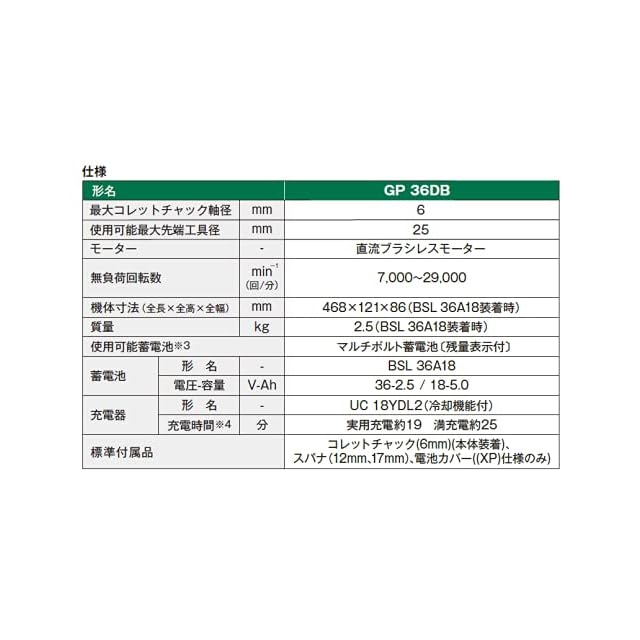 標準付属品:コレットチャック(6mm)(本体装着)、スパナ(12mm、17mm)各1個、蓄電池(BSL36A18X)×1個、急速充電器、ケース、電池カバー