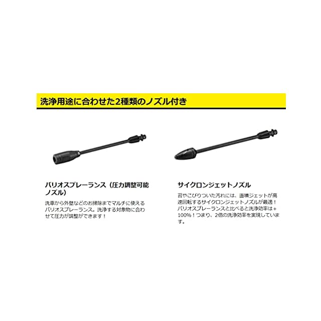 付属品:10m高圧ホース、トリガーガン、サイクロンジェットノズル、バリオスプレーランス、自吸用ホース、デッキクリーナー