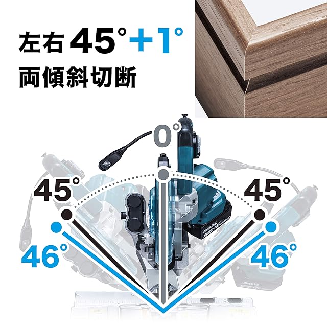国内初165mm充電式で左右両傾斜(国内販売165mm充電式スライドマルノコにおいて。2019年9月現在、マキタ調べ。)。