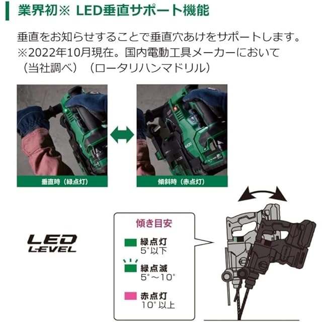 業界初!※1 「LED垂直サポート機能」搭載。LEDライトの点灯状態により本体の傾きをお知らせします。※2 ※1.2022年10月現在。国内電動工具メーカーにおいて(当社調べ)(ロータリハンマドリル) ※2.LED垂直サポート機能は、重力方向に対する水平/垂直を示すものであり、傾斜面に対して垂直を示すものではありません。壁など、重力に対して直立している面の場合では、対象面に対して上下5°の範囲を検知しますが、対象面の左右に対しては検知しません。また、穴をあけている間(スイッチを引いている間)は点灯しません。穴あけ前後の機体の角度確認に使用してください。