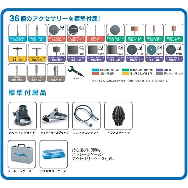 【多種多様な用途】彫刻/削り出し/研削/研ぎ・刃付け/切断・切削/汚れ落とし/磨き/研磨/穴あけに適したアクセサリー21種30ピースが標準付属。