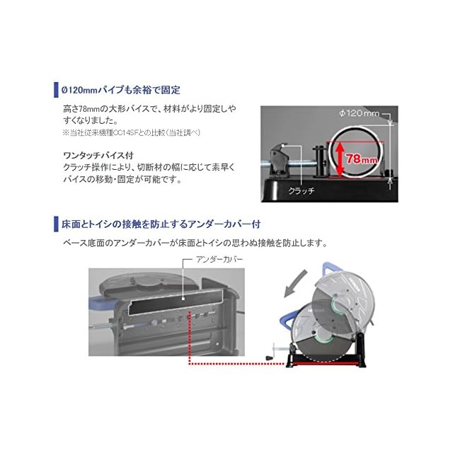 最大切断能力:[○パイプ]0°120mm、45°115mm・[L形鋼]0°130mm、45°100mm