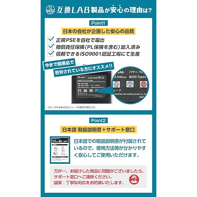 【日本語説明書付き】海外業者の販売する互換バッテリーとは違い、日本語の製品マニュアルを同梱しています。