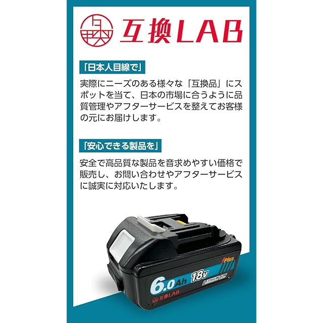 【商品説明】互換LAB(互換ラボ)シリーズのMAKITA互換バッテリー18V 6.0Ahより、さらにパワーアップした「MAKITA互換バッテリー18V 6.0Ah PLUS」が登場しました!日本の会社が安全性や品質にこだわって企画し、正規のPSEの届け出を自社で行い、ISO9001認証の信頼できる中国工場にて生産しているMAKITA 互換バッテリーです。「カットオフ(過放電防止)機能」を搭載、USB QC3.0&PD(Type-C)出力ポートの設置、実容量6000mAhにバージョンアップしています。マキタ純正の電動工具はもちろん、草刈機、掃除機、集塵機、ブロアー、空気入れなど18Vの機種には全て対応しており、問題なくご使用いただけます。DC18RC、DC18RF、DC18RAなどの純正バッテリー充電器での充電も可能です。