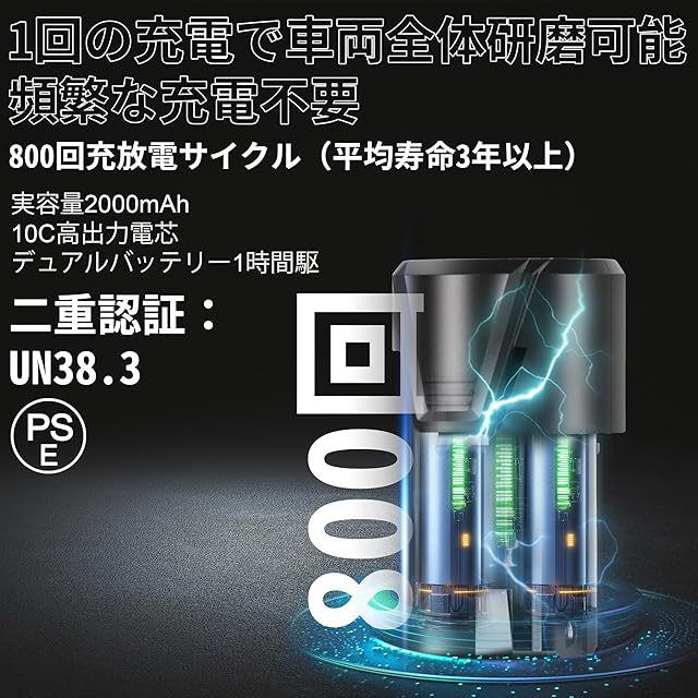 ワン充電で車両全体を研磨可能:2000mAh実標容量・デュアルバッテリー循環作業。フル充電45分・連続稼働1時間を実現し、頻繁な充電から解放。実測800回フル充放電後も80%以上容量を維持(1日1回使用で3年以上の長寿命)。交換コストを大幅低減。PSE認証および国際UN38.3安全試験を通過。安心してお使いいただけます