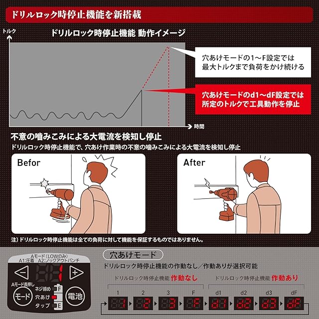 【ドリルロック時停止機能を新搭載】穴あけ作業時の不意の噛みこみによる大電流を検知し停止。穴あけモードでサポート。