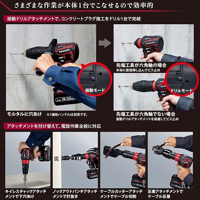 パナソニック(Panasonic) 電動ドリルドライバー 本体のみ EXENA 14.4V/18V対応 充電式 ONE ATTACH対応+BRAIN φ110mm換気扇下穴あけ可能 電動ドリル EZ1DD3X-R レッド