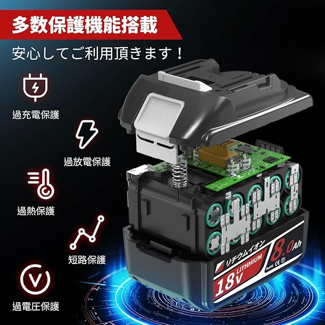 【業界トップクラスの大容量設計】本製品にはA+ グレードの高品質なセルを採用し、8000mAhの大容量があり、大きくBMS基板で過充電防止回路や高温防止回路など各種安全回路を搭載しています。従来の3000mAhや6000mAhモデルと比べ、同じコンパクトサイズでありながら、最大2.6倍の容量アップ(3000mAh比べ)。電動工具交換の中断回数が激減し、作業フローの最適化が可能です。
