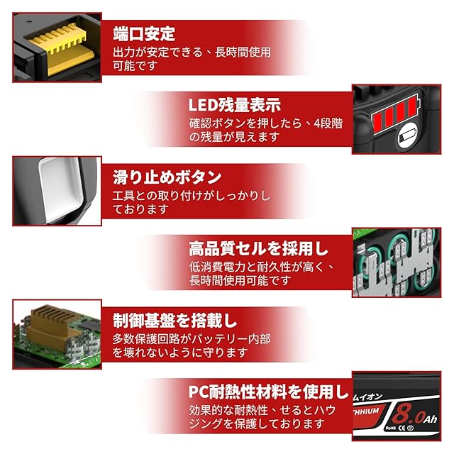 【製品仕様】型番:Boetpcr マキタ 18v バッテリー BL1860B 電圧:18v 容量アップ:8000mAh 着脱方式:スライド式 充電池種類:リチウムイオン電池(Li-ion) 個数:4個 日本国内PSE認証済 LED残量表示付きBMS基板搭載 多数保護機能付き 安定性に定評のある高品質なセルを採用して、純正品と比べても負けない!