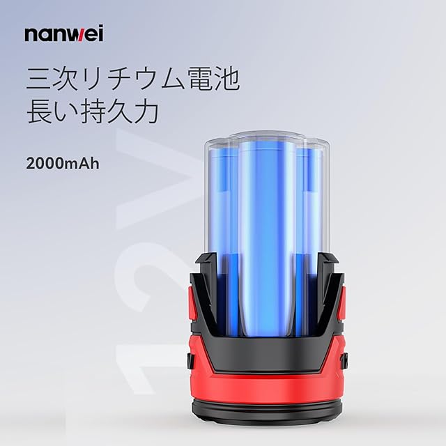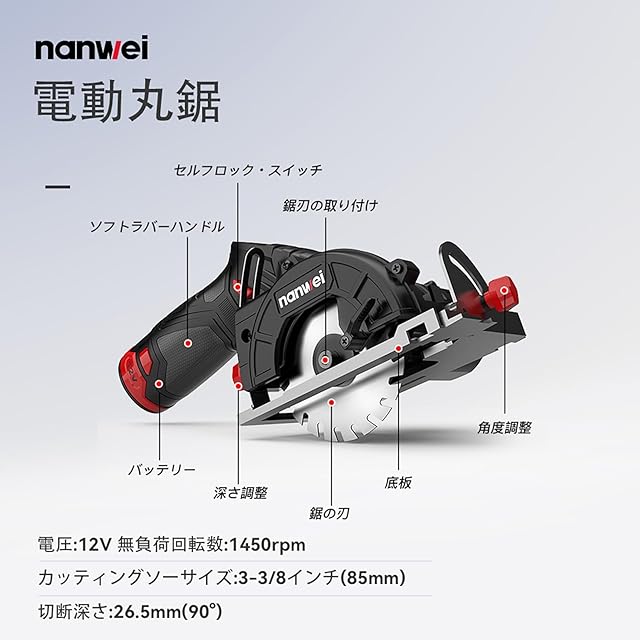 商品名:NANWEI 12V小型丸鋸 最大切削26.5mm 刃径85mm 45°角度調整可能 ミニ丸鋸 コードレス 電動丸ノコ 丸ノコ充電式 小型丸ノコ 2.0Ahバッテリー2個 USB充電式 石材・木材・金属の切断