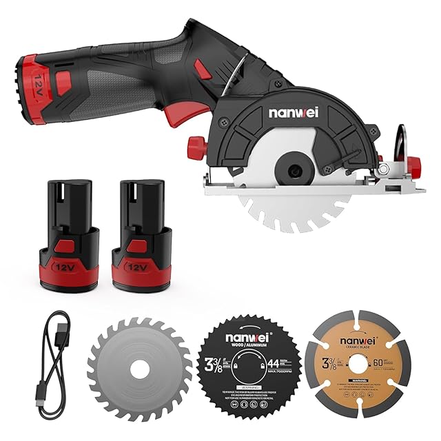 NANWEI 12V小型丸鋸 最大切削26.5mm 刃径85mm 45°角度調整可能 ミニ丸鋸 コードレス 電動丸ノコ 丸ノコ充電式 小型丸ノコ 2.0Ahバッテリー2個 USB充電式 石材・木材・金属の切断
