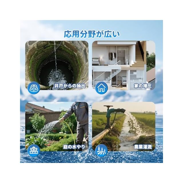 『応用分野が広い』:Poafamx 電動井戸ポンプ&増圧ポンプは浅い井戸や池、立水から水を排水したり、蛇口や排出パイプに直接接続したりできます。新鮮な水を効率的に供給し、芝生に散水し、庭に散水し、農地に灌漑し、庭をきれいにするのに役立ちます。