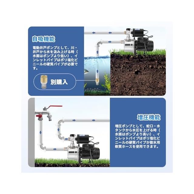 『2-IN-1電動井戸ポンプ&増圧ポンプ両用』Poafamx 全自動ブースターポンプは電動井戸ポンプとしてもブースターポンプとしても使用でき、多機能な2in1でコストパフォーマンスに優れています!電動井戸ポンプとしては、水タンクが本機より高い場合や、深さ6-7mまでの井戸、河川や池から水を汲み上げることができ、水道管に接続すれば農業用灌漑や庭の散水にも簡単に使用できます。ブースターポンプとして、家の水道管に設置し、家庭用水の水圧を上げることができます。