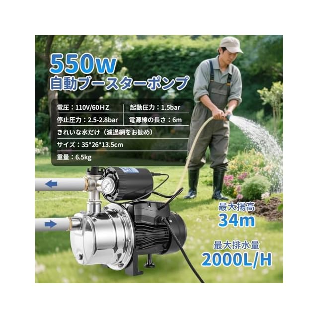 商品名:Poafamx 全自動ブースターポンプ 550W 自動停止・自動給水 圧力タンク付き 電動井戸ポンプ 増圧ポンプ 最大給水深6-7m 2000L/H 最大揚高34M 全家増圧 自動給水 排水ポンプ 散水ポンプ ステンレススチール 池の排水 庭/芝生の水やり 農業灌漑 110V/60HZ 日本語取り扱い説明書付き