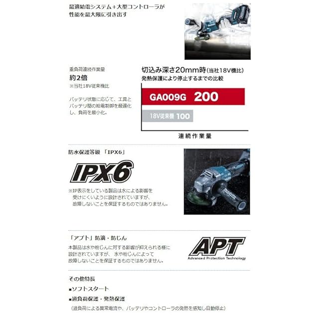 パドルスイッチ+ブレーキ付。離せば止まる安心仕様。40Vmax仕様でAC機を超える切断能力。(マキタ100mmAC機比)。切断スピード約40%アップ(マキタ100mmAC機比)。最適給電システム+大型コントローラで重負荷連続作業量約2倍(マキタ18V機比)。BLモータのパワーアップやベアリングの大型化で高耐久を実現。