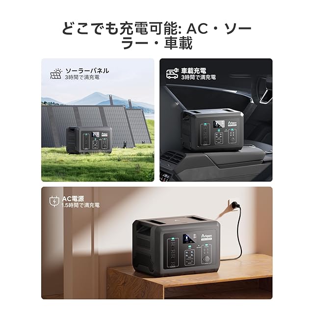 [多様な充電方式と充電モード] 1000WのACコンセント充電に加え、車載充電(別売)やソーラーパネル(別売)など多彩な充電オプションに対応。キャンプ前夜や当日の朝でも素早くフル充電可能なので、予定通りに出発準備が整います。アウトドアはもちろん、緊急時にも即座に対応できる迅速充電が特長。どんな状況でも電源確保の心配がありません。