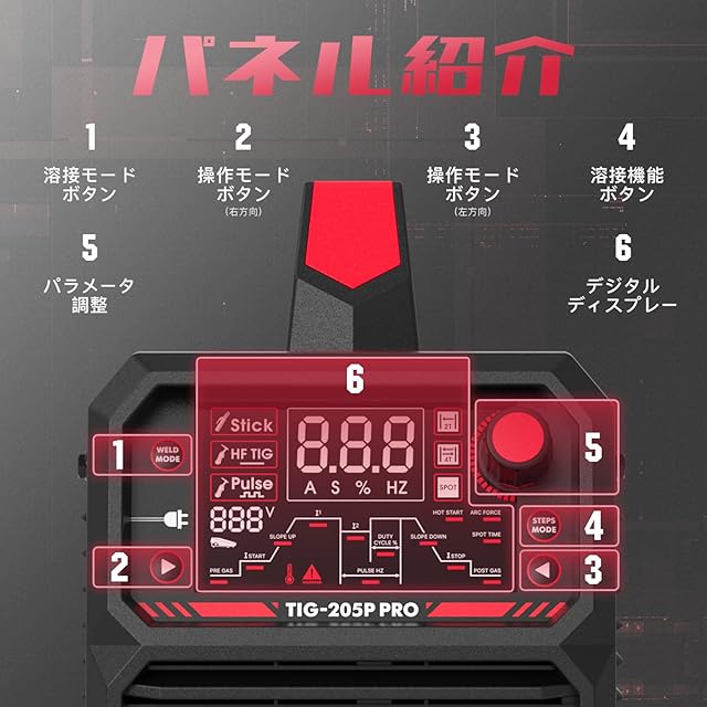 3 IN 1 TIG溶接機:1台でSTICK/DC TIG/PULSED TIGに対応。多様な溶接ニーズにお応えします。大型LEDディスプレイで電流、機能モード、溶接モードなどのデータをより明確に確認可能。
