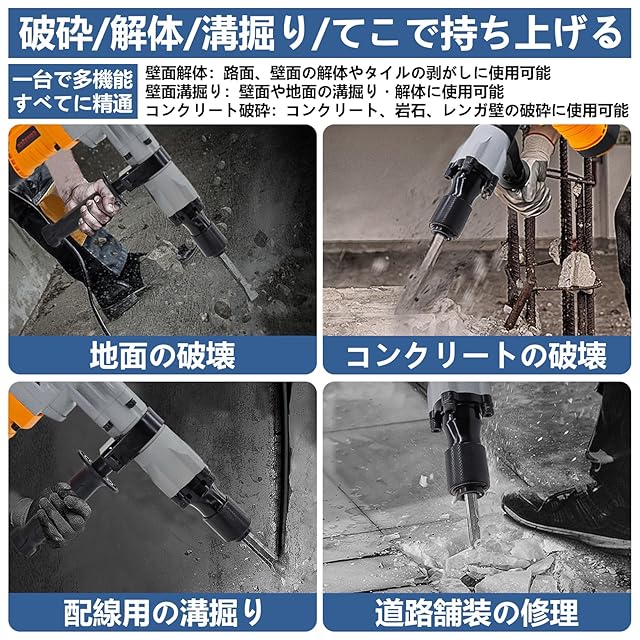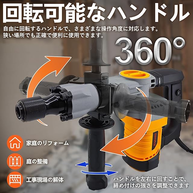 【強力なシリンダー、衝撃力抜群】35mmの大直径シリンダーを搭載し、最大4590BPMの衝撃頻度を提供します。これにより、コンクリートやレンガ壁などの硬い材料を簡単に粉砕できます。家庭のリフォームや建設作業にも最適です。また、電動ハンマーには滑り止めハンドルと減震設計が施されており、長時間の作業でも快適な操作感を維持し、疲れを軽減します。これらの使いやすい設計は、操作をさらに安全で快適にします