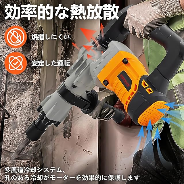 【純銅モーター、強力な動力】このコンクリートハンマー、大出力の純銅モーターを搭載しており、2400Wの強力な動力を提供し、さまざまな材料に対応できます。 本体はわずか5.64kgで、軽量なデザインにより、長時間の作業も楽にこなせます。さらに、コンクリート破砕機は多風道冷却システムを搭載しており、機械内部の熱を迅速に放出してモーターの安定した動作を保ち、負荷の大きい作業にも対応可能です