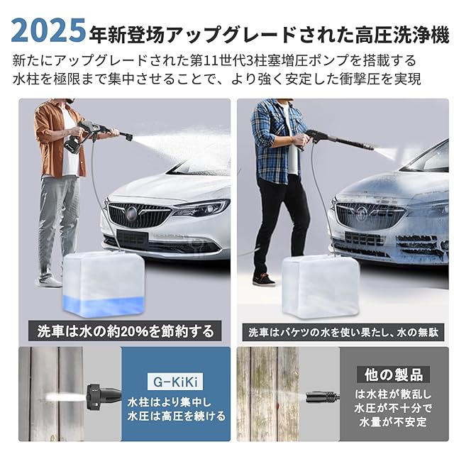 【2025年新款登場、第11世代3柱ピストンポンプ、8MPaの強力水圧、節水率20%!】G-KiKiは2025年新モデルとして、さらに進化した高圧洗浄機をお届けします。高性能な純銅モーターを搭載し、8MPaのパワフルな水圧を実現。従来製品よりもさらに効率的な設計で、洗車時間を毎回15分以上短縮可能です。第11世代3柱ピストンポンプの精密な設計により、水流が集中し、安定した強力な圧力で頑固な汚れを簡単に除去します。洗車ごとに約20%の節水が可能で、効率的かつ環境に優しい設計で日常の清掃ニーズに最適です。ご注意:すべての製品は出荷前に100%の品質検査を行っております。初回使用時に少量の水が残っている場合がありますが、性能には影響ございませんのでご安心ください。