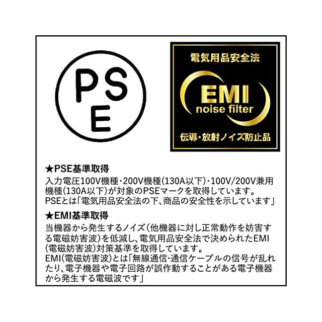 安心、安全にご使用いただける電気用品安全法(PSE)および放射ノイズを低減するEMIに対応。