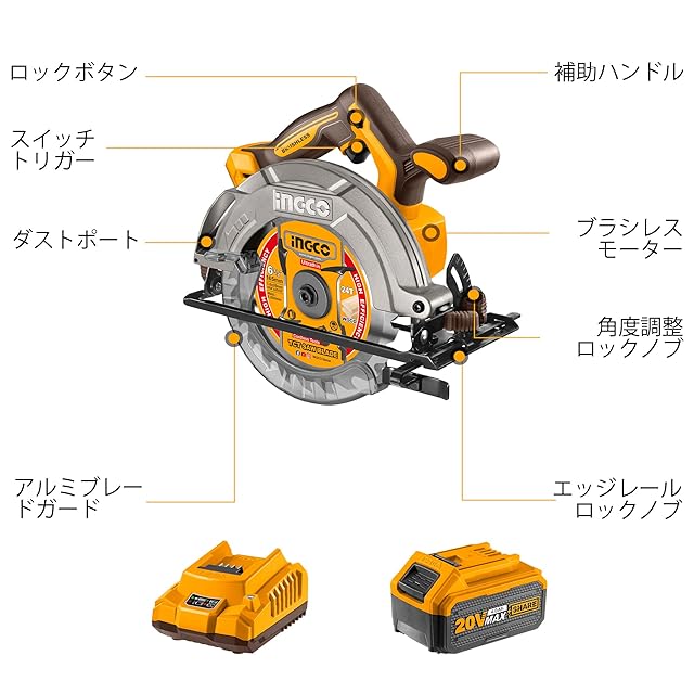 【注意】:INGCOコードレス丸鋸 は 本体です。 INGCO バッテリーのみで兼用、すべての INGCO リチウムイオン 20V 電動工具と互換性があります。