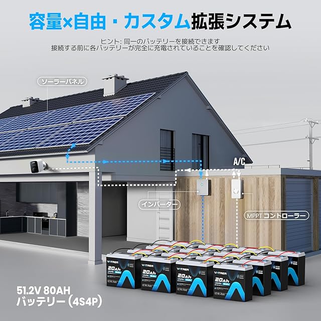 【拡張可能でパワーアップと幅広い用途】VATRER POWER 12V20Ah リン酸鉄リチウムバッテリーは最大より高い電圧(24V / 36V / 48V)とより多くの容量(最大48V)を手に入れることができます。倒したり重ねたりも気軽に使えるため、様々なシーンで活躍です。ポータブル電源 リン酸鉄バッテリーは震災時の予備バッテリー、照明、デジタルカメラ、、電動アシスト自転車、水中ライト、魚群探知機、RVなどに適用します。注意:このバッテリーは電気エネルギー貯蔵に適され、パワーバッテリーとしての使用には対応できません。