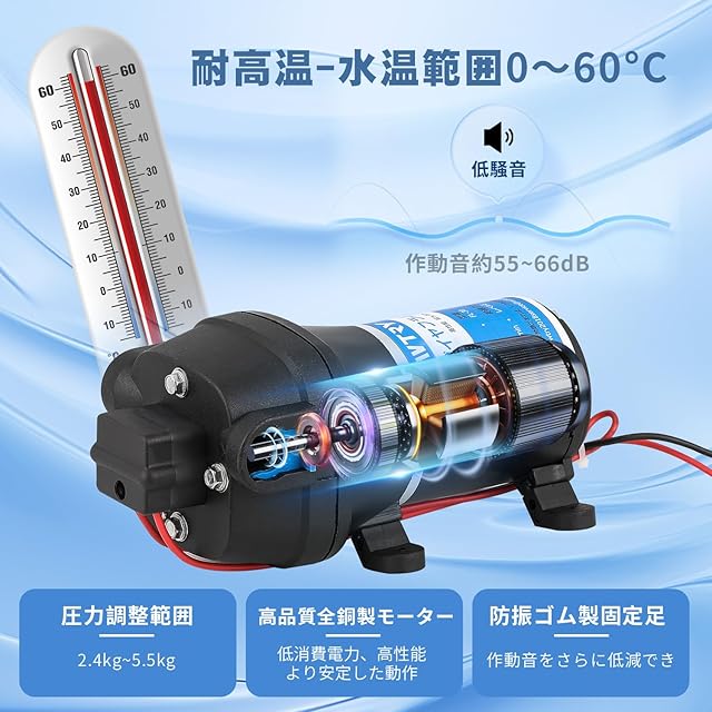 【仕様】電圧:DC 12V // 電流:7.9 A // パワー:95W // 流量:12.5L/min // 吸引範囲:水平3m、垂直2m // 揚程:25m // 停止圧力:35Psi/2.4Bar