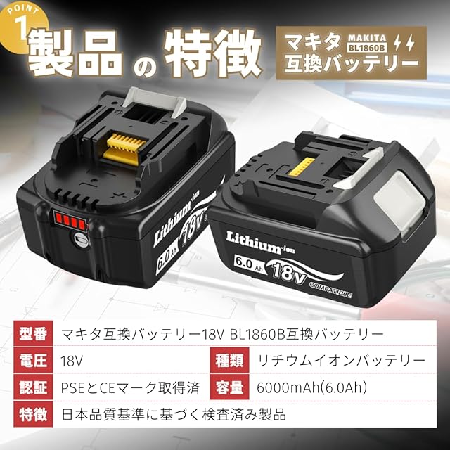 マキタ互換品 BL1860B 18V 互換バッテリー 6.0Ah 4個 セット 電動工具用 A-60464 互換品 日本企業 電池残量表示 PSE認証 保護機能 BL1815N BL1820B BL1830B BL18140B BL1850B BL1860B Longsafe (4個セット)