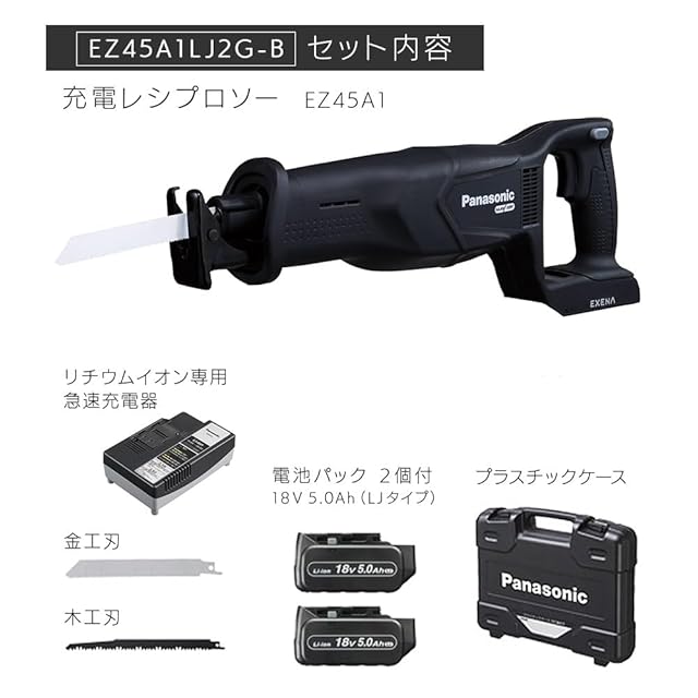 パナソニック 充電レシプロソー (電池パック18V 5.0Ah×2/プラスチックケース/急速充電器/金工刃・木工刃×各1)デュアル 14.4V/18V対応 金属管Φ130mm コードレス 防塵 耐水 IP56 建築現場 作業場 EZ45A1LJ2G-B ブラック