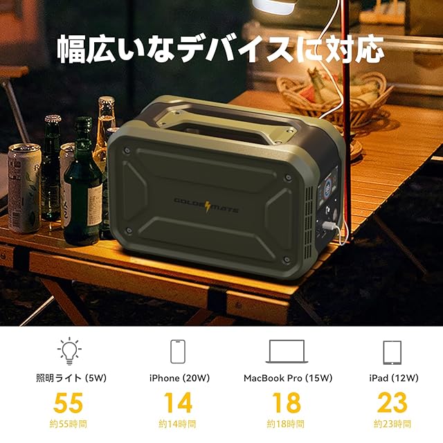 【液晶ディスプレイ&APP操作&LEDタイト付】LCDディスプレイにより、製品の稼働状況が一目瞭然!充電完了時間、出力、残量など、すべての情報がひと目で確認でき、初心者でも安心して使えるポータブル電源です。専用アプリ「GOLDENMATE」を通してスマホから使用状態の情報を確認できます。また、LEDライトを搭載しており、暗い場所や非常時にも便利に使えます。