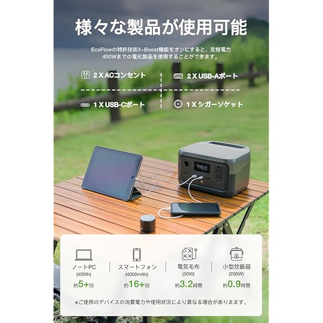 【日常、レジャーから緊急時までこれ1台で電力がまかなえるボータブルバッテリ】 RIVER 2は、バッテリー容量256Whのコンパクトなポータブル電源です。ACx2、USB-Ax2、USB-Cx1、シガーソケットx1の合計6個の出力ポートが搭載されています。スマートフォンやタブレット、ノートパソコン、電気毛布、冷蔵庫、テレビ、扇風機など、幅広い電化製品をコンセントのない場所からでもご使用いただけます。