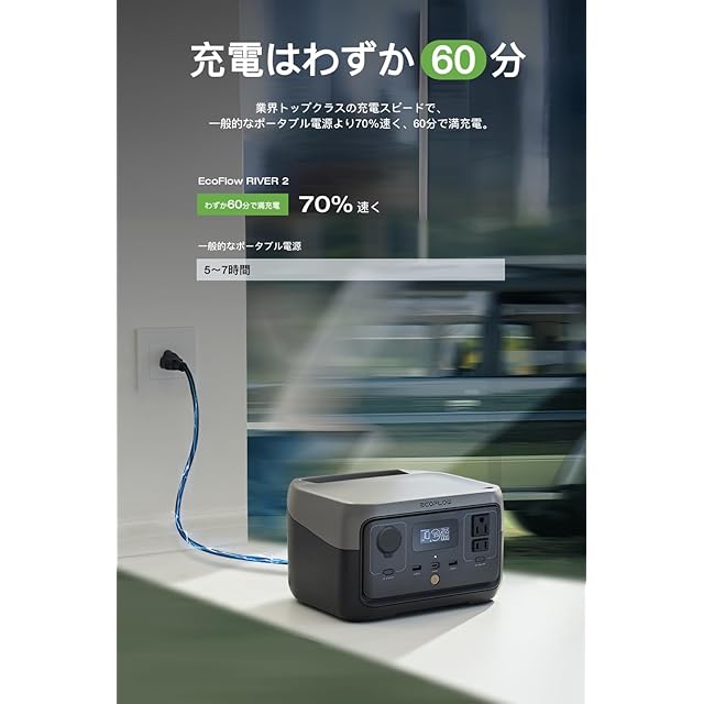 【業界トップクラスの高速充電ポータブル電源】 ポータブルバッテリーを選ぶ際に、容量や出力と同じくらい大切なのが充電スピードです。EcoFlowのポータブル電源には特許取得済みのX-Stream充電テクノロジーが採用されており、RIVER 2 はわずか60分で満充電が可能です。これは業界平均より5倍速く、従来のRIVERシリーズより38%高速です。急に電源が必要なときにRIVER 2 の充電を忘れていても、ACコンセントで短時間の間にフル充電されます。また、環境にやさしいソーラー充電にも対応しており、EcoFlowの110Wソーラーパネルとつなげると、約2.3時間で満充電されます。AC充電以外に太陽光発電が利用できるため、災害などでグリッドが遮断された停電時などでも使用できます。