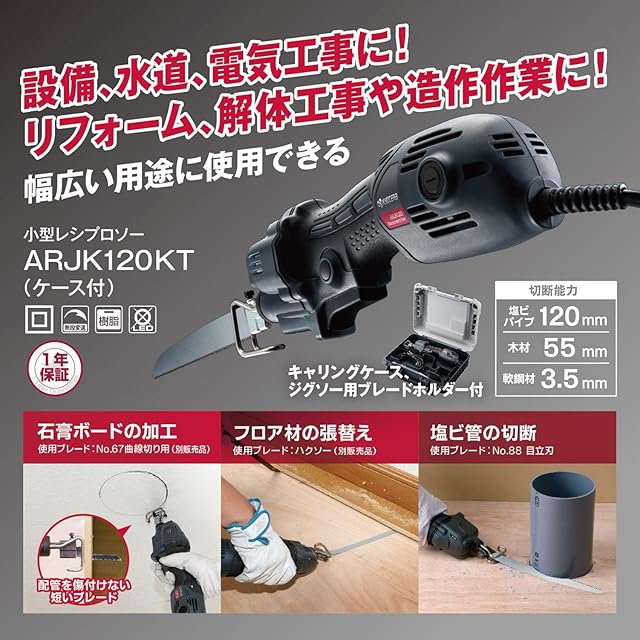 京セラ(Kyocera) 旧リョービ プロ用 小型レシプロソー ARJK120KT 619450B ブラック 【細身&軽量ボディで隅や際などの作業に最適】 切断能力 (塩ビパイプ)120mm・(木材)55mm・(軟鋼材)3.5mm ストローク量10mm ジグソー刃用ホルダー&キャリングケース付