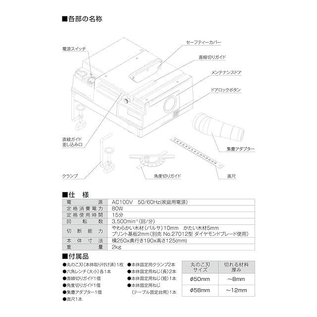 付属品:チップソー10山・丸鋸刃荒目・本体固定クランプ2個・直線ガイド・角度ガイド