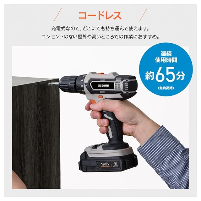 ハイパワー×軽量、充電式ドライバドリル[18V]。【スピード調整機能】高速と低速の2段階を切り替え。さらに握った分だけスピードが変わるので、細かくスピードが調整できる。トルク(締め付ける力)は豊富な18段階で、素材に合わせて調整可能。