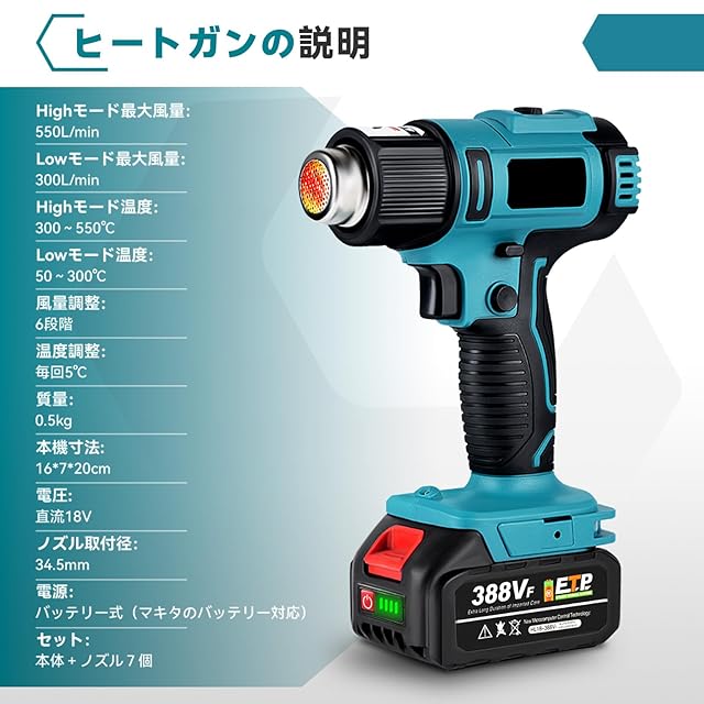 【マキタのバッテリー互換可能&豊富な付属品】:この コードレスヒートガンセットにはノズルが7つ付属しており、ほとんどの使用場合に適しています。 コードレスヒートガンはマキタの18vシリーズバッテリーと互換性があるため、すでに持っている方には【コードレス式ヒートガン本体のみ】を買うことができ、電池付きセットを購入する必要がなく、追加コストを節約することができます。
